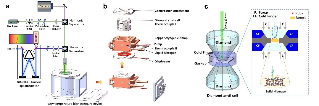 高压光谱学是研究高压相变、高压化学反应机理、高压下材料的物性的重要原位实验测量手段。目前大多数高压光谱研究主要在室温条件下进行,而低温高压光谱实验主要以高压冷却降温为主的研究手段。由于设备和技术等方面的限制,在低温等温压缩的条件下开展高压原位光谱测量的研究仍相对较少,需要克服光学窗口结霜、低温下压力加载和超长工作距离下小样品信号探测优化等挑战。商用低温高压光谱设备通常不能满足大部分高压实验需求,绝大多数重要材料的低温高压相边界仍然没有被实验确定。因此,开发低温等温压缩下进行光谱测量,不仅可以通过实验确定P-T斜率较大相边界,还可以研究低温条件下声子等元激发对压力的响应特性。