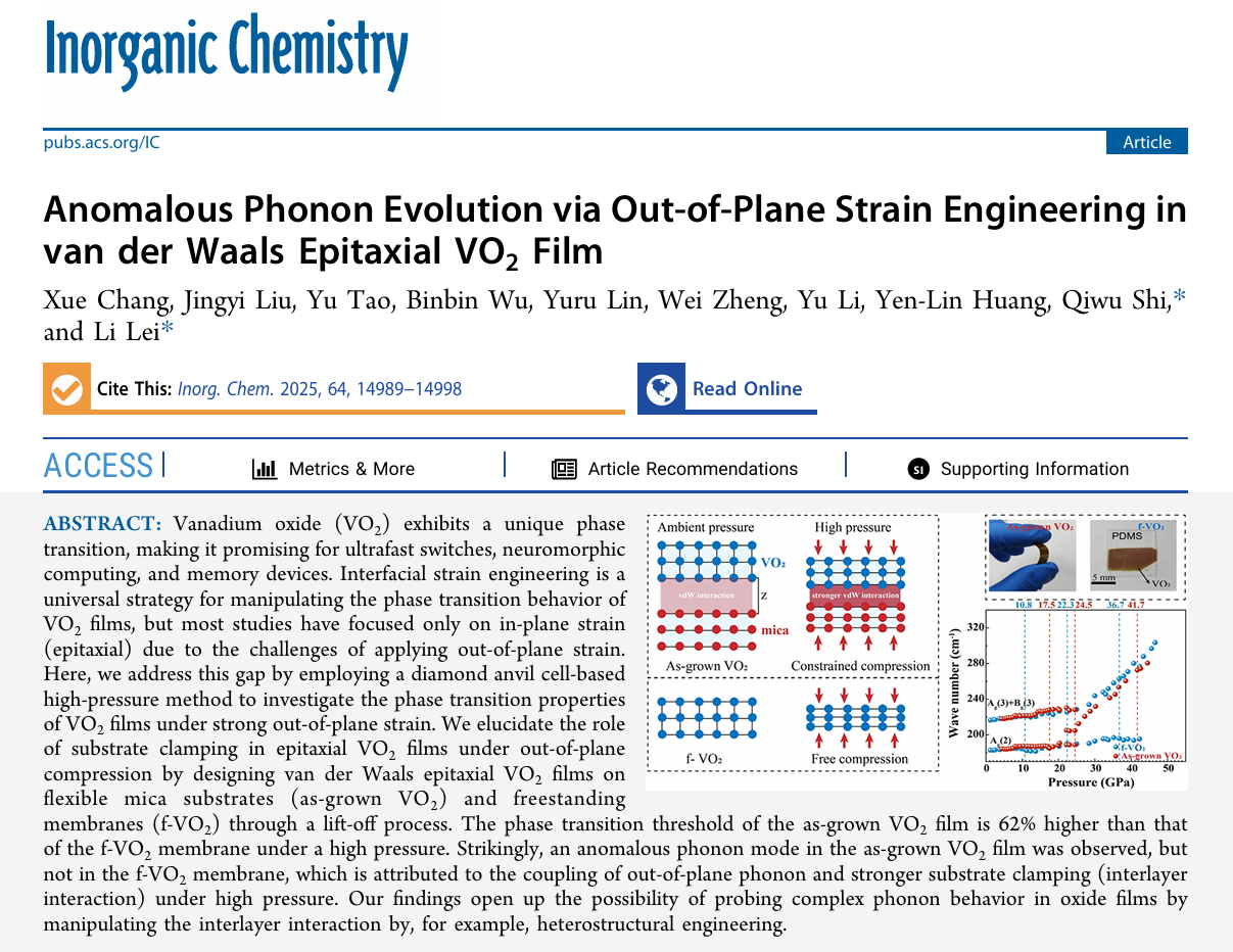 近日,四川大学原子与分子物理研究所雷力研究员团队在Inorganic Chemistry上在线发表了题为 “Anomalous Phonon Evolution via Out-of-Plane Strain Engineering in van der Waals Epitaxial VO₂ Film”的最新研究成果。该工作通过原子与分子物理研究所雷力研究员团队与材料与科学工程学施奇武教授课题组的合作研究获得,原子与分子物理研究所2023级博士生常雪为论文第一作者,四川大学雷力研究员与施奇武教授为共同通讯作者。